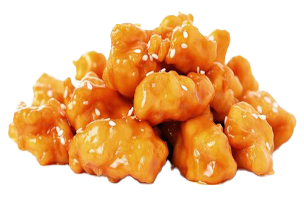 Golden crispy chicken delicately coated in a vibrant, sweet and tangy orange glaze.
