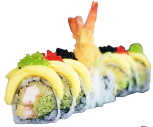 Shrimp tempura, crab sticks, cucumber, top with mango yumyum sauce, 4 different tobiko on top.